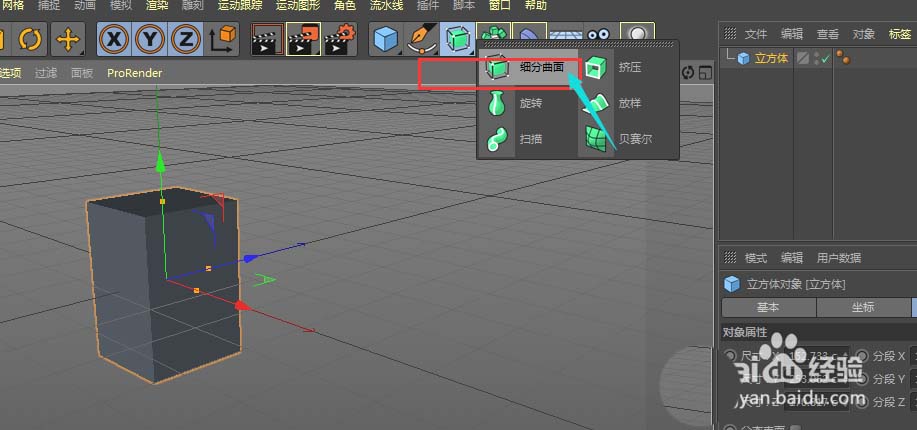 基础形状有了,但边角太硬朗了,完全不像圆凳。这时候就该“细分曲面”上场了。在菜单中找到并添加一个细分曲面生成器。