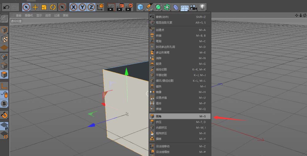 第四步,调出倒角工具。最快捷的方式是选中面后,直接按 M~S 键。当然,你也可以在视图空白处点击鼠标右键,从右键菜单中选择“倒角”功能。