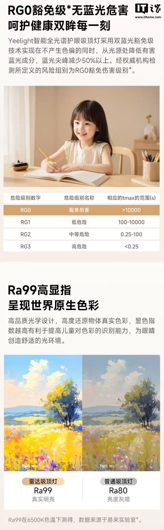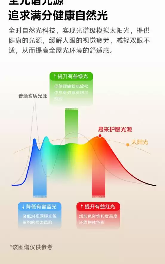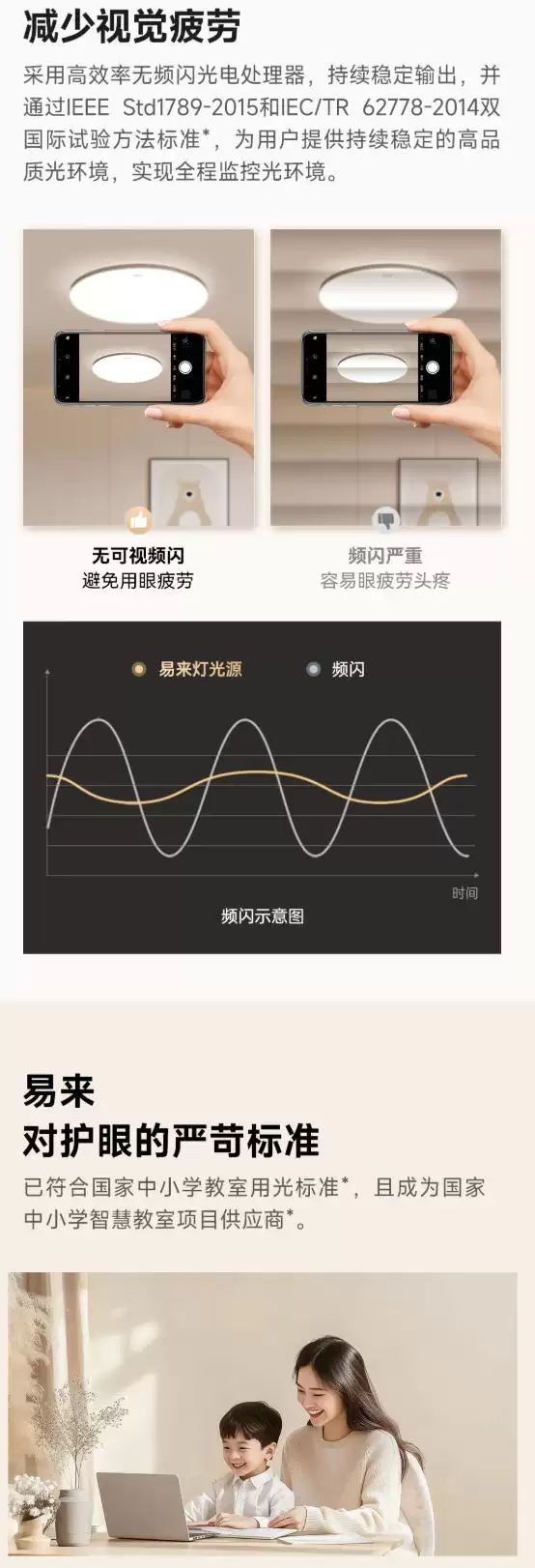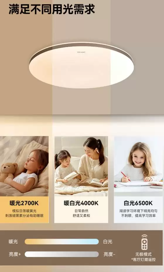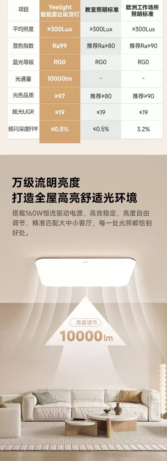 在关乎视觉健康的灯光素质上,这款吸顶灯也下了功夫。它采用了双蓝光豁免级技术,简单来说,就是在从光源处降低有害蓝光成分的同时,避免了光线色偏,让物体色彩保持真实自然。其显色指数达到了Ra99,非常接近太阳光的显色能力,能为阅读或休闲创造更舒适、不易疲劳的用光环境。此外,它配备了高效率的无频闪光电处理器,宣称实现了无可视频闪,并搭载了160W的恒流驱动电源,用户可以根据不同场景自由调节亮度范围。