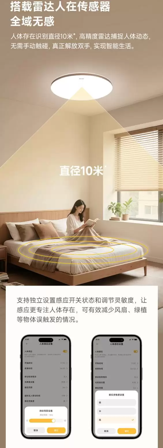 它的核心亮点,在于那颗内置的高精度毫米波雷达传感器。传统的人体感应容易受限于静态场景,而这款产品通过AI算法,能够同时识别人体的静态存在与动态活动,探测直径可达10米。这意味着,在大多数家庭客厅或卧室中,你无需再寻找开关或呼唤语音助手,从进门到安坐,灯光都能自动响应。更实用的是,它支持对感应开关状态和灵敏度进行独立设置,这能有效规避风扇转动、绿植摆动等常见干扰,大大降低了误触发的概率。