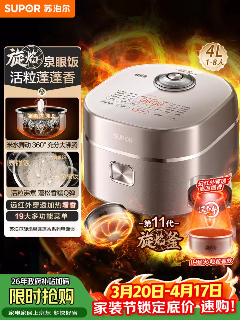核心参数:第11代4.0mm旋焰釜内胆、底部6座“小火山”设计、38°旋焰角、1300W底部IH加热、150W上盖远红外加热、103℃高温增香、19种功能、4种米种选择、3mm玻璃面板、金属机身、304不锈钢蒸笼、24小时预约。