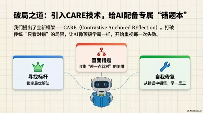 正是瞄准了这一核心痛点,传音TEX AI中心与合作伙伴的研究团队共同开发了一项名为CARE的新技术。CARE的全称是“对比锚定反思”,其核心思路是从训练机制上进行革新。传统方法大多只关注“最终答案的对错”,并用此作为模型学习的反馈信号。但CARE技术将关注点大幅前移,聚焦于推理过程本身。它将那些“高质量的错误样本”——即那些答案接近正确,却在关键推理步骤上出现偏差的解题路径——作为重要的训练材料。通过将这些有瑕疵的路径与标准答案的完美路径进行细致的对比分析,并引入一套“反思式重推理”机制,模型能够精准定位自己到底在哪一步“想岔了”,从而完成自我修正。这一过程,就好比一位有经验的老师,不仅指出学生的错误,更引导学生回溯思考步骤,找到思维误区所在。实验证明,在引入这套反思机制后,模型面对复杂问题的二次推理成功率,从原先约10%–19%的水平,显著提升至76.6%,极大地增强了其解题的稳定性与鲁棒性。