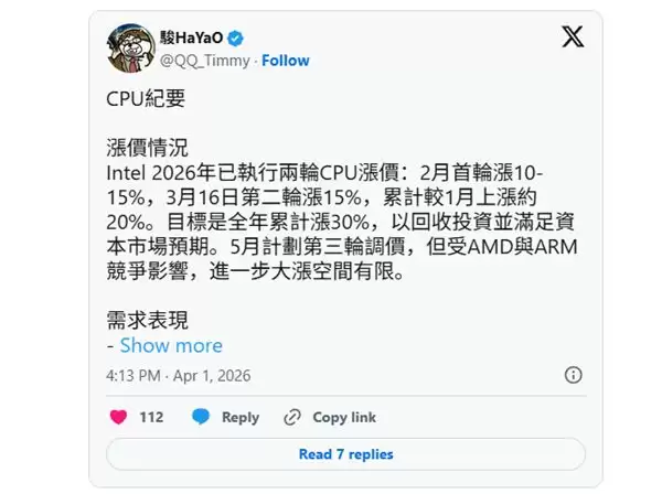 2026年刚开年,消费级CPU市场就迎来了一记重拳。短短三个月内,Intel已经接连落地了两轮涨价。而根据其内部规划,年内还将有第三轮调价在等着消费者。算下来,全年累计涨幅最高可能冲击30%——这个数字,无疑给今年的装机市场投下了一颗重磅冲击波。