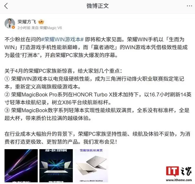 荣耀终端产品线总裁方飞近日的一则动态,算是给四月的PC市场投下了一枚重磅预告。她透露,即将亮相的荣耀WIN游戏本将凭借极致性能,成为玩家征战“三角洲行动”这类硬核游戏的利器,并正式拉开荣耀PC产品线大规模爆发的序幕。