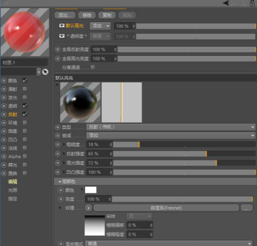 文字材质则可以玩些花样。颜色随你喜好,这里主要调整几个关键通道:“不透明度”可以稍微降低,增加一点通透感;“反射”通道里添加GGX反射,并降低一些亮度,能让文字表面产生细腻的光泽。具体参数设置参考下图。