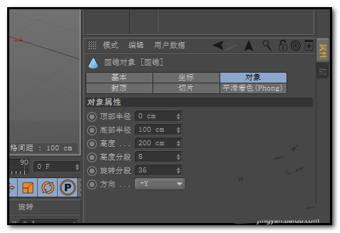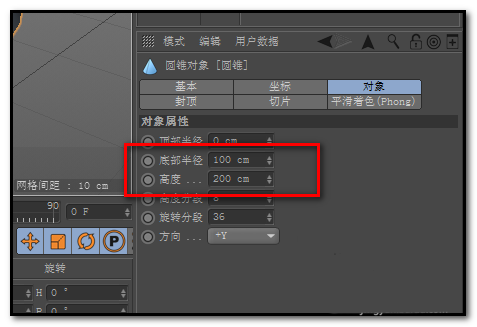 举个例子,在场景中添加一个圆锥体。从属性面板可以看到,它的底部半径是100CM,高度是200CM。