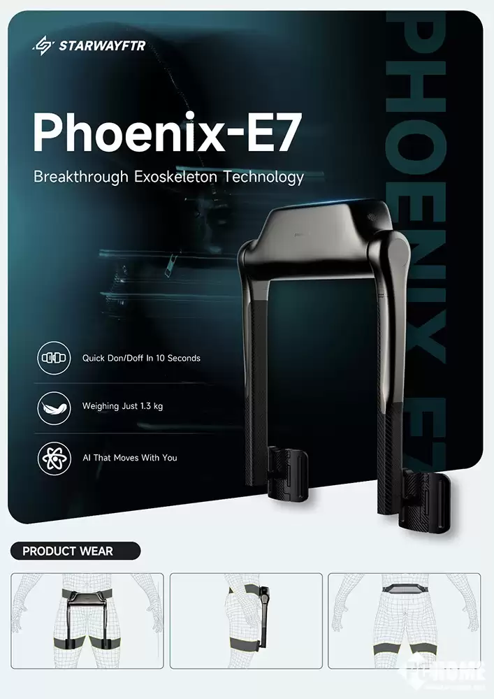 星路未来带来的Phoenix E7,主打的是“极致便携×高扭矩密度”的消费级助力外骨骼概念。它的主机仅重1.3公斤,比一台轻薄笔记本还要轻,关节部分可折叠,能轻松塞进背包甚至大衣口袋。