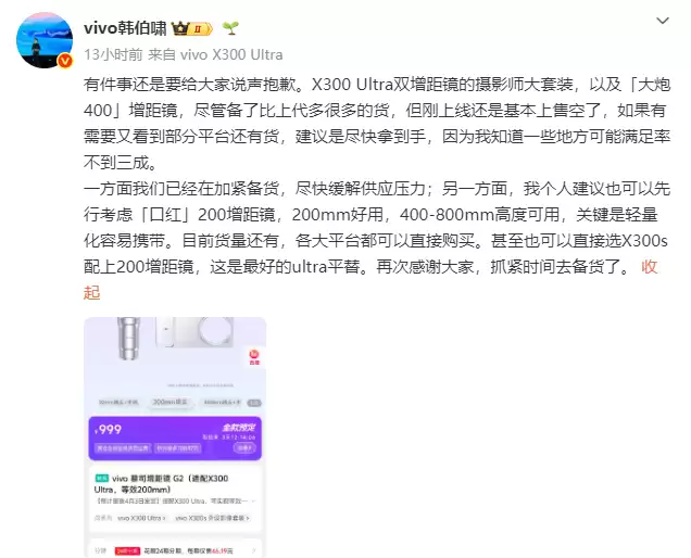 最近,vivo产品经理韩伯啸的一则消息,在数码圈里激起了不小的水花。他透露,尽管已经做了比以往更充足的准备,但为vivo X300 Ultra打造的“摄影师大套装”(内含双增距镜),以及那颗单独的「大炮400」增距镜,基本上已经卖断了货。目前,工厂正在加紧生产,以应对这波意料之外又情理之中的抢购热潮。