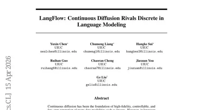 如今,来自伊利诺伊大学的这项研究,提出了名为LangFlow的框架,首次让连续扩散模型真正追平、甚至在某些任务上超越了离散扩散的水平。研究团队像一位经验丰富的机械师,将前人模型拆解开来,精准定位了三个关键的设计失误,并逐一修复,最终让这只鸭子重新展翅飞翔。