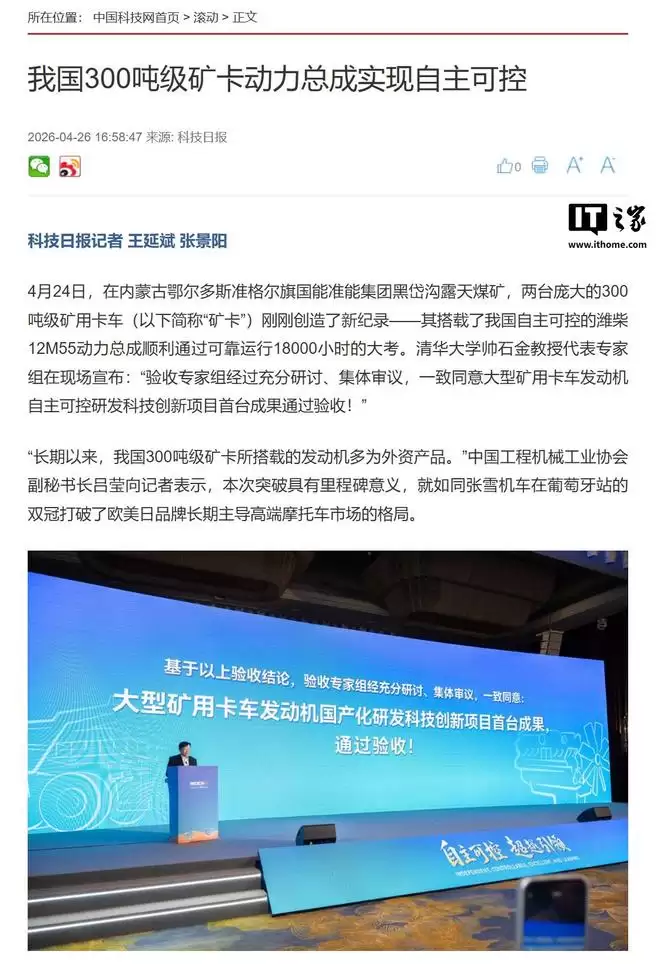 在大型矿山装备领域,一项新的纪录刚刚诞生。4月24日,两台搭载着我国自主潍柴12M55动力总成的300吨级矿用卡车,成功通过了可靠运行18000小时的严苛考验。这个数字,对于长期被外资品牌主导的超大型矿卡动力市场而言,无疑是一个标志性的突破。