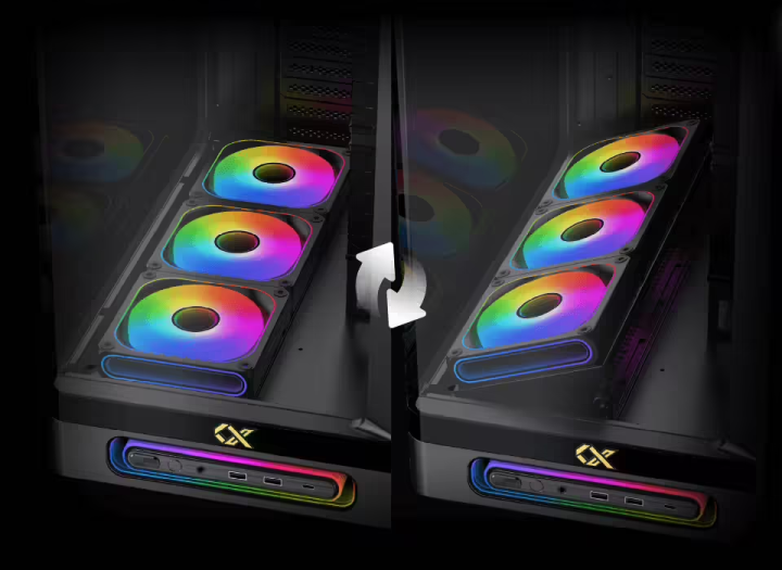 如果说全景玻璃是颜值担当,那么模块化的散热架构便是这款机箱的性能内核。其底部创新性地设计了一个支持三档角度调节的风扇支架,用户可根据硬件配置和散热需求,自由调整底部进风的角度。这个支架最多可安装3颗120mm风扇或对应规格的冷排,从而显著优化从底部进入的气流效率。