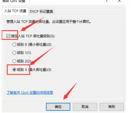 在新弹出的窗口中,勾选“指定入站TCP吞吐量级别”。然后,在下拉菜单中,选择“级别 3”(最大吞吐量),最后点击“确定”。这一步有助于优化计算机接收数据的能力。