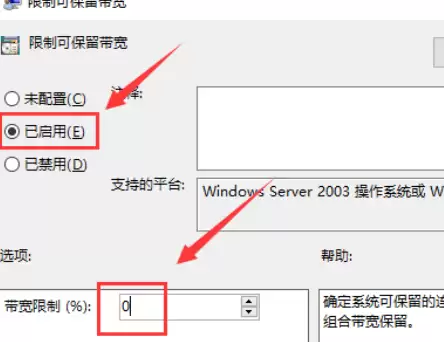 这是最关键的一步。在弹出的设置窗口中,首先选择“已启用”。然后,你会看到下方有一个“带宽限制”百分比选项。重点来了:将其数值由默认的80%修改为 0。这意味着系统将不再保留带宽用于其他目的,全部带宽都可用于你的网络活动。设置完成后,点击“确定”保存。