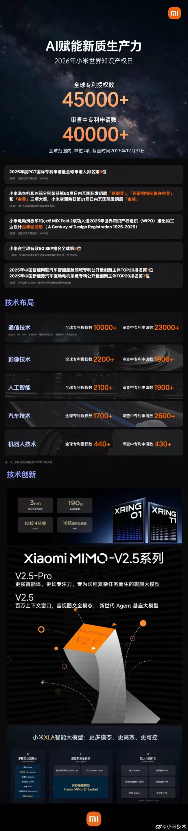 今天是2026年世界知识产权日,科技圈的目光再次聚焦于创新与保护。小米技术官方微博适时发布了一份成绩单,展示了其在技术创新与知识产权领域的积累。一个核心数据尤为引人注目:截至2025年底,小米集团全球授权专利数已突破4.5万项。这不仅仅是一个数字,更是其长期研发投入的具象化体现。