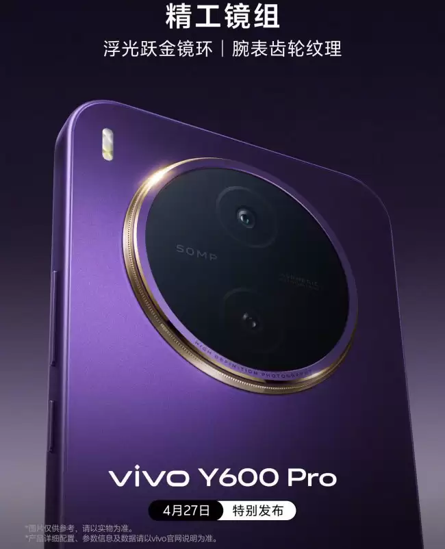 从设计语言看,vivo Y600 Pro 延续了近期流行的后置大圆镜组造型。不过,它在细节上做了文章:镜环采用了“浮光跃金”的设计,并融入了类似高端腕表的齿轮纹理。这种处理方式,显然是想在简约的圆形中增添几分精致感和辨识度。