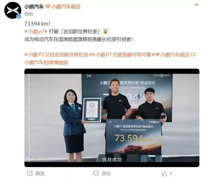 最近汽车圈有个挺有意思的消息:小鹏汽车旗下的P7车型,在吉尼斯世界纪录的官方认证下,成功拿下了“电动汽车湿滑路面最长漂移距离”的称号。具体成绩是多少呢?73.594公里。这个数字一出来,算是给电动汽车的性能表现,又添了一个硬核的注脚。