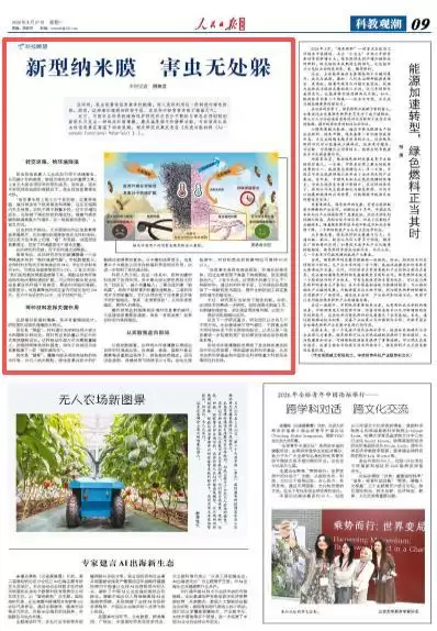该纳米纤维薄膜研究展现了其在绿色害虫防治中的应用前景,得到国家自然科学基金、北京市自然科学基金和中国农业科学院重大科技任务等项目的支持。(本报记者 周姝芸)