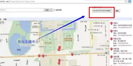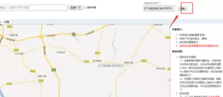 找到你想要的地点后,用鼠标左键单击一下。此时,该地点的坐标值便会自动填充到页面右上角的文本框里。旁边还有一个“复制”按钮,点击一下,坐标就保存到你的剪贴板了,整个过程非常流畅。如下图所示: