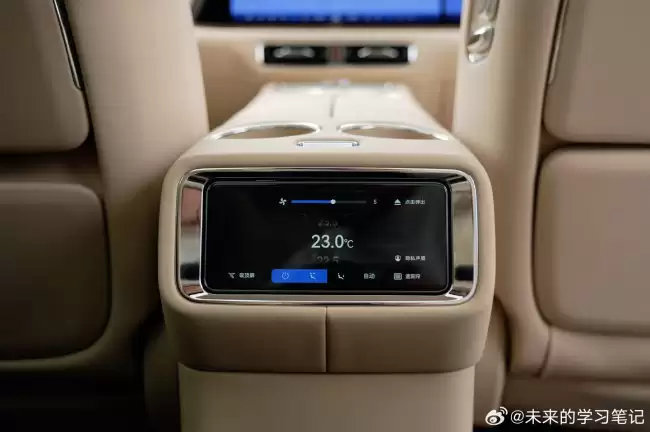 视线前移,鸿蒙智行标志性的星环散射体也没有缺席,算是家族身份的印证。中央扶手箱的设计则充分体现了MPV对功能性的追求:双手机无线充电板(中间隔断疑似支持按压隐藏或弹出)、精致的水晶旋钮、双杯架以及一个双开门储物箱,布局紧凑且实用。