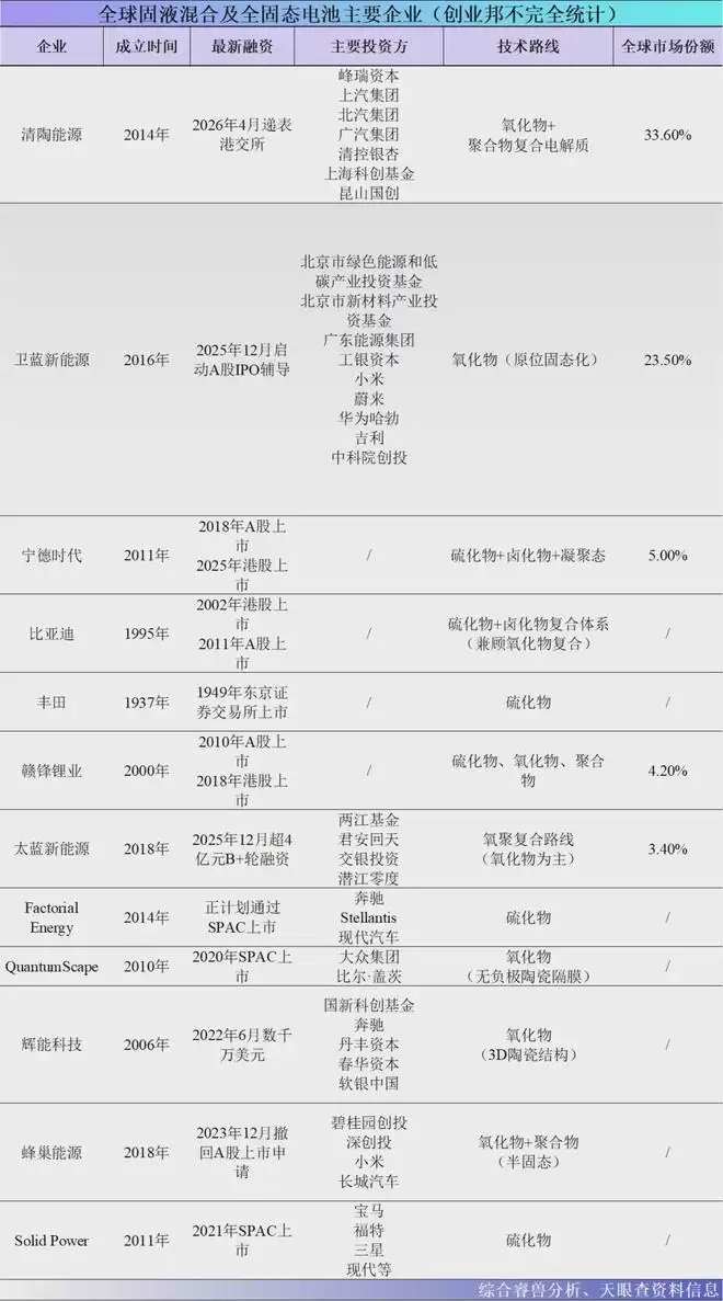 目前的市场格局尚未固化,呈现出“一超多强”的态势。2025年,清陶能源以33.6%的全球份额排名第一,卫蓝新能源、宁德时代、赣锋锂业、太蓝新能源等紧随其后,前五名合计份额不足70%,变数依然很大。