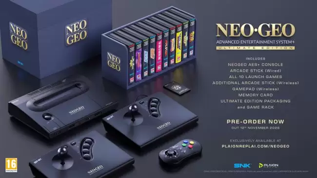 而对于终极收藏家,SNK还准备了限量终极版。这个版本包含黑色主机、全部10款首发游戏卡带、有线及无线摇杆、无线手柄、记忆卡以及游戏收纳架等,售价高达150,000日元 / 999.99美元。
