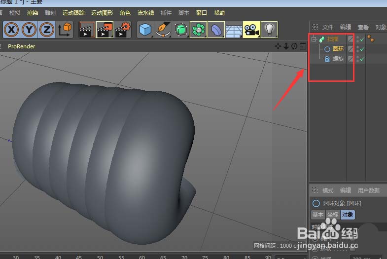 最关键的一步来了。在右侧的“对象管理器”中,用鼠标拖动“圆环”和“螺旋”这两个图层,依次放进“扫描”图层的下级,成为它的子集。注意,顺序不能错:要把“圆环”放在上面,“螺旋”放在下面。当你完成这个操作,左侧视图区的变化会告诉你——有门儿了,一个基础的弹簧轮廓已经显现。