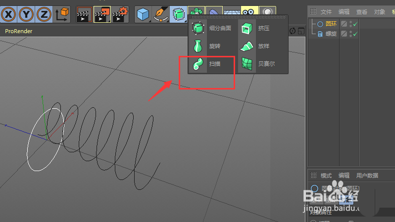 光有路径还不够,我们还得给这条“骨架”配上“血肉”,也就是扫描的截面。再次点击那个钢笔图标,这次选择“圆环”。这样,场景里就有了第二个对象——一个圆环形状。