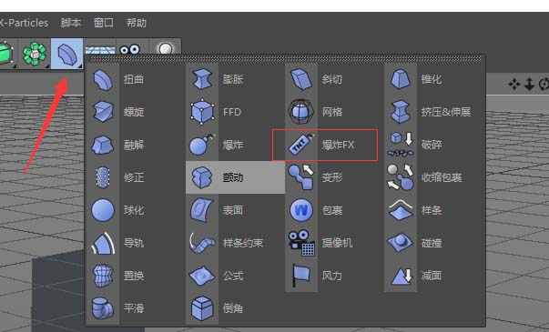 接下来就是实现破碎的核心步骤。在运动图形菜单下,找到并添加“爆炸”效果器。这里有个重要操作:在对象管理器中,直接将这个爆炸FX拖动到立方体对象的下面,使其成为立方体的子级。这样,效果器才能正确作用于这个立方体。