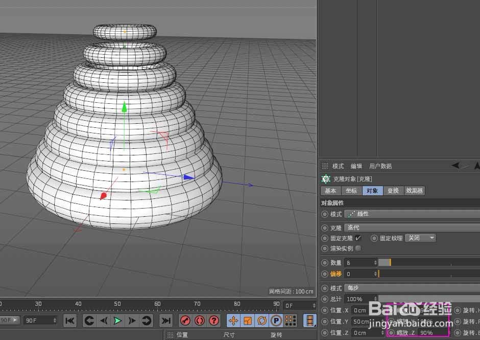 6、怎么做出从下往上越来越小的感觉?秘诀在【缩放】参数。把X、Y、Z三个轴向的缩放值分别改成90%。这样一来,每个新克隆出的圆环都会比上一个缩小10%,递减的层次感就出来了。