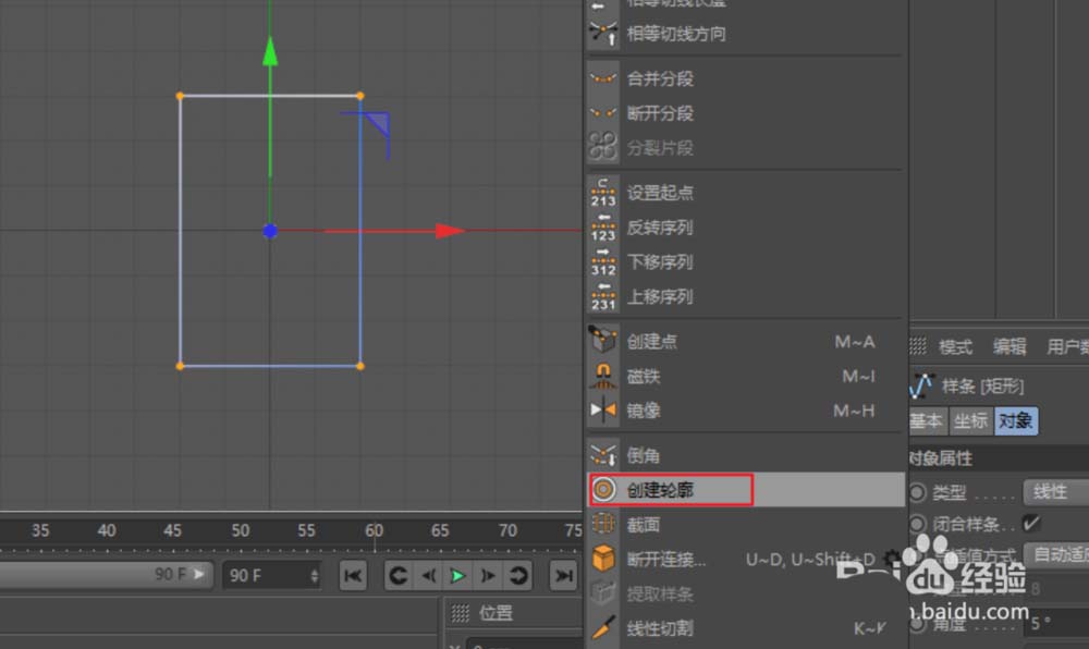 接下来,让这个矩形“进化”一下。右键将它转为可编辑多边形,进入点模式,选中全部的四个顶点。然后,创建一个宽度为20的轮廓。看,一个精细的窗框外轮廓立刻就出来了。
