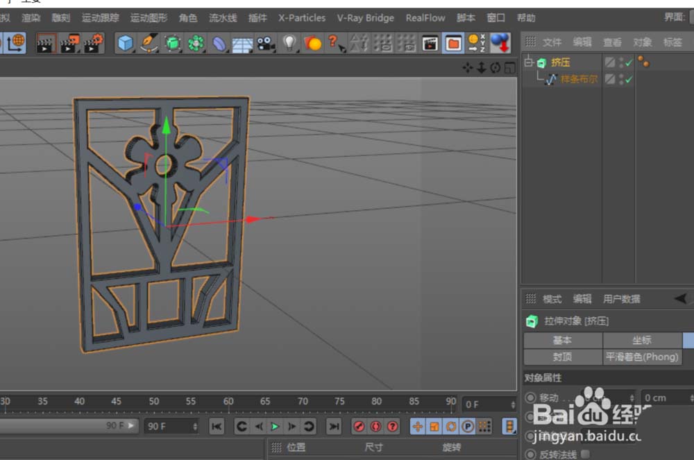 大功即将告成。现在,把布尔运算后得到的、那根完整的花窗样条线,拖到“挤压”生成器的子级里。剩下的就是锦上添花了:调整挤压的厚度,为边缘添加上合适的倒角。看,一个富有立体感和细节的精美花窗模型,就这样从二维样条中诞生了。整个过程是不是既有逻辑又充满趣味?
