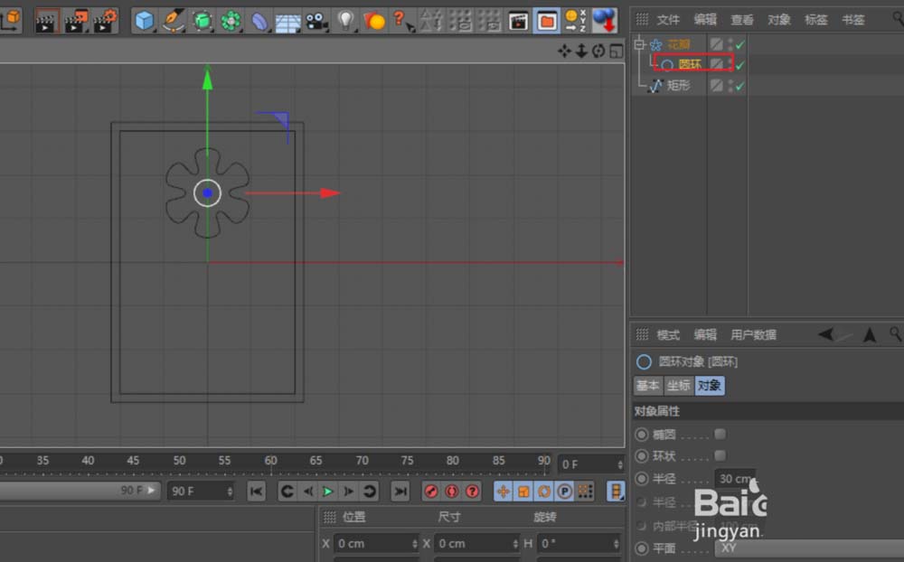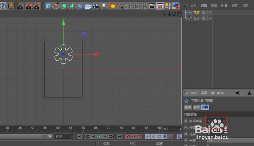 好了,花窗怎么能没有花朵呢?切换到花瓣样条,开始调整它的形态。根据你想要的风格,灵活修改半径和花瓣数量(可以参考图中的参数)。在花瓣中心,别忘了加上一个圆环作为花蕊。制作完成后,把这两个图形作为一个整体,移动到窗框的中上部,找个最合适的位置放好。