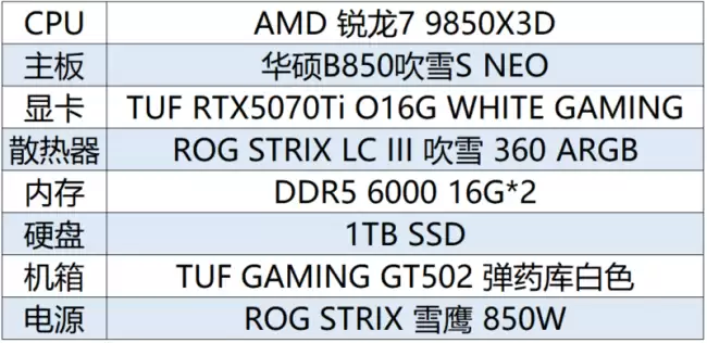 首先来看这套兼顾颜值与性能的白色海景房方案。整套配置以华硕ROG B850吹雪S NEO主板为核心,搭配专为游戏而生的AMD锐龙7 9850X3D处理器,以及华硕TUF RTX5070Ti O16G WHITE GAMING显卡等一众高性能硬件。不仅能高画质流畅运行各类3A大作,整机统一的白色主题和ARGB灯效,更能带来无与伦比的沉浸式游戏氛围。