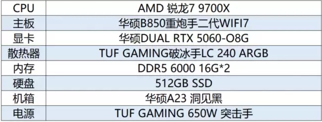 如果你更偏爱紧凑机箱和硬核的军工风,那么这套“电竞小钢炮”方案可能更对你的胃口。它以华硕B850重炮手二代WIFI7主板为核心,搭配能效比出色的AMD锐龙7 9700X处理器和华硕DUAL RTX 5060 O8G显卡,同样能让你高帧率畅玩主流游戏。