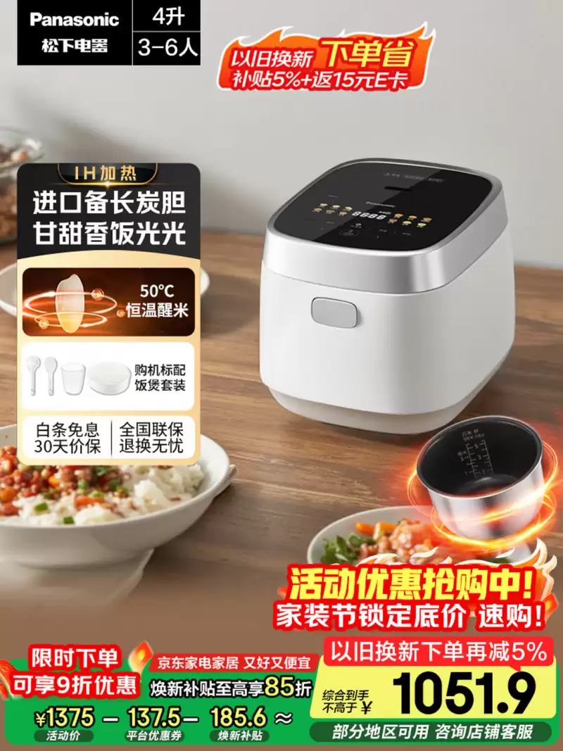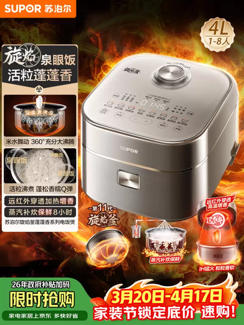 核心配置:3L容量,适合2-3人的小户型或租房家庭。1000W功率,底部采用4组花瓣状IH包裹加热,配合126℃上盖赤炎板补炊和1.2倍真微压沸煮技术,使米饭口感软糯Q弹。外观设计也颇具颜值。