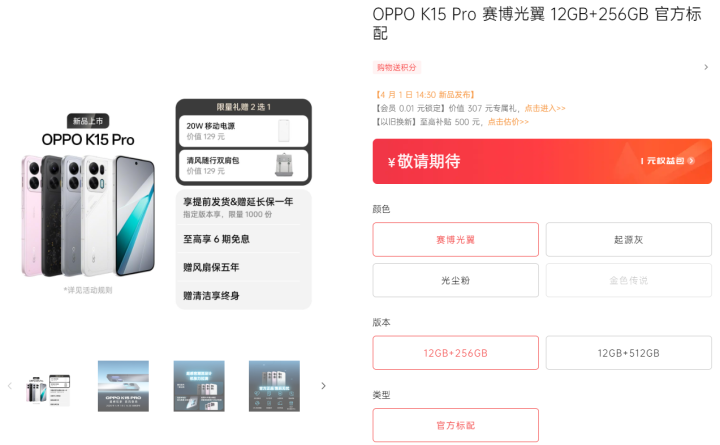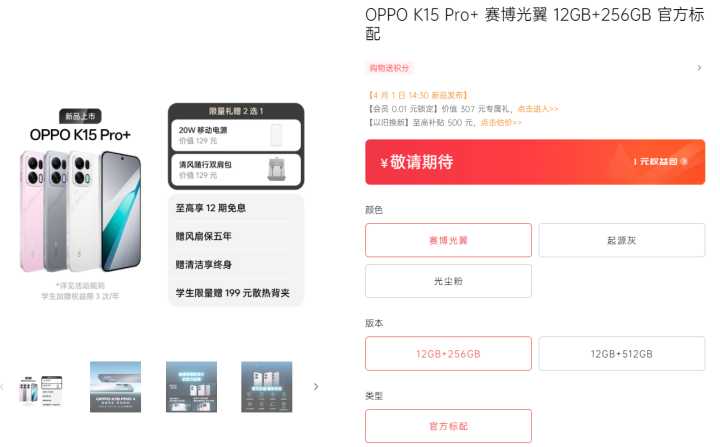 OPPO K15 Pro系列的发布日期定在了4月1日。有意思的是,虽然还没正式亮相,但这个系列的两款新机,目前已经能在OPPO官方商城预约了。不过,仔细看官网提供的配置选项,能发现一个耐人寻味的细节:全系列只提供了12GB的RAM版本,至于很多人期待的16GB大内存,这次并没有出现。