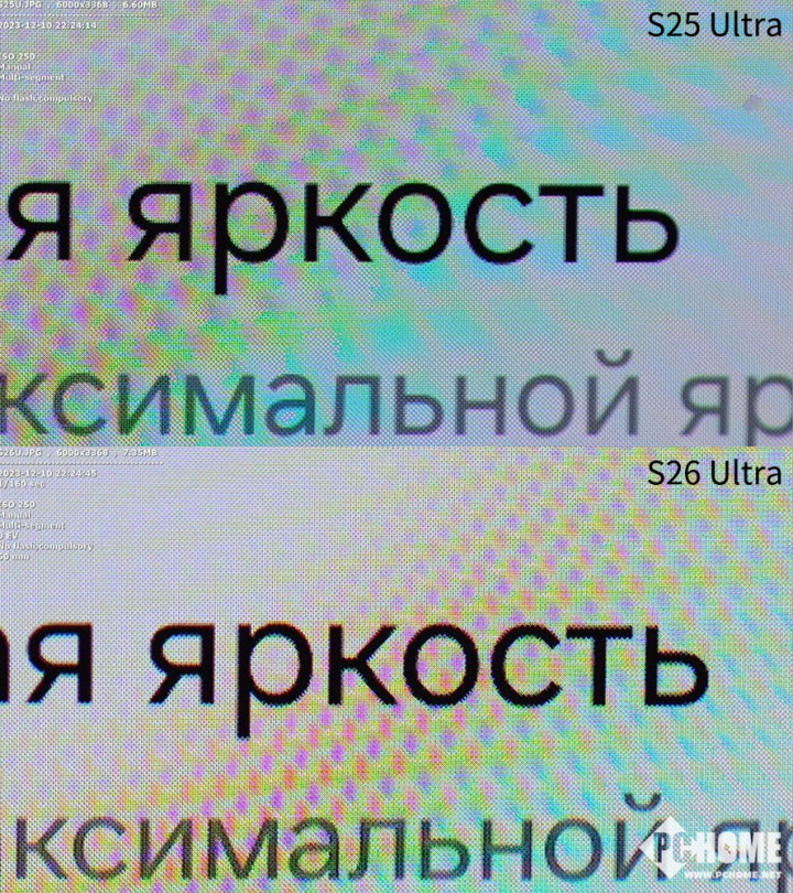 如果把视线拉得更近,关注显示细节,差异会更明显。在与前代机型Galaxy S25 Ultra的对比中,S26 Ultra的字体边缘在显微镜下显得更为粗糙,而S25 Ultra则保持了更好的平滑度。在显示纯色,尤其是灰色时,S25 Ultra的均匀性也更好,S26 Ultra则出现了一定的色偏现象。