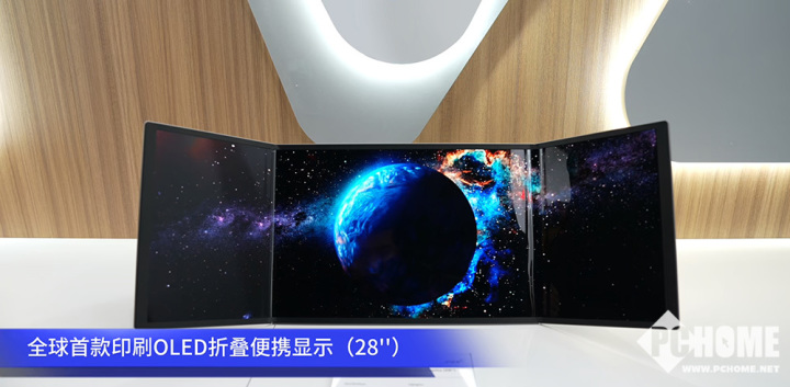 同时,印刷OLED的柔性特质也被充分发挥。现场展出的全球首款印刷OLED折叠便携屏颇具想象力:展开厚度仅4.48毫米,折叠时为16英寸,展开后则变成一块28英寸的带鱼屏,使用场景极其灵活。它搭配了全球最大尺寸的水滴铰链和背部一体式支架,支持横屏、竖屏及多角度悬停,完美兼顾了移动办公与大屏娱乐的需求。