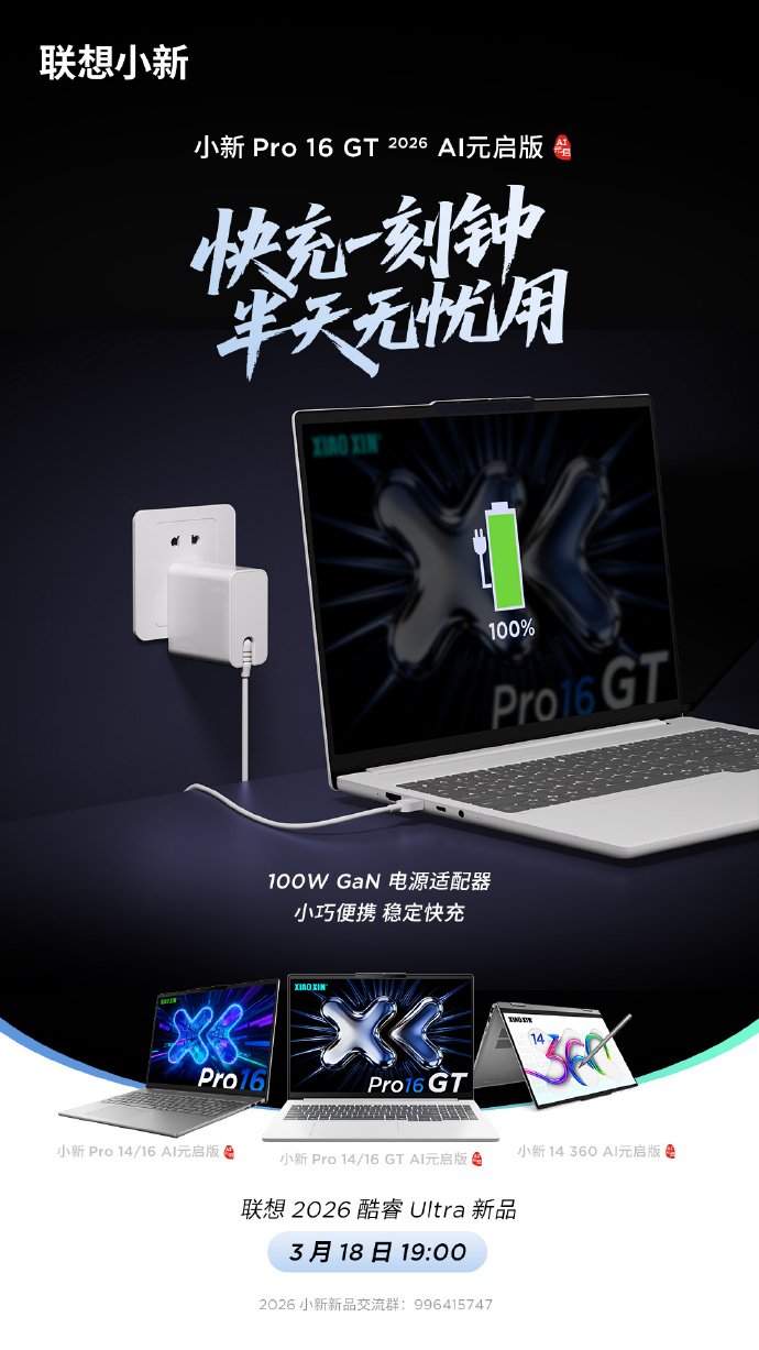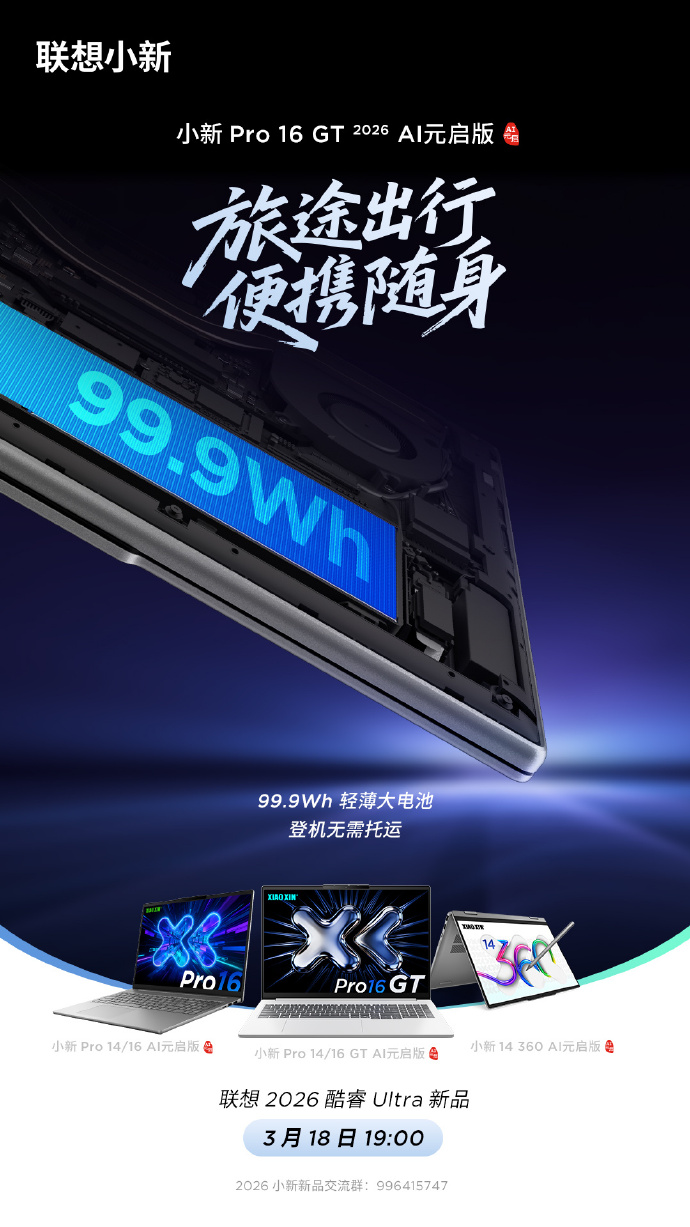 最新消息显示,联想小新Pro 16 GT AI元启版笔记本的发布日程已经敲定:2026年3月18日晚上7点,这款备受瞩目的新品将正式亮相。其核心卖点非常明确——搭载了英特尔第三代酷睿Ultra处理器,并围绕99.9Wh超大容量电池、高达77%的核显性能提升以及深度的本地AI功能构建起独特优势。