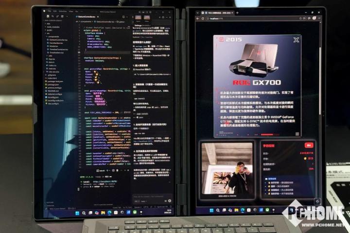 双屏,自然是它的灵魂所在。它搭载了两块完全一致的16英寸ROG星云原画屏,组合展开后带来等效超过21英寸的广阔视野。这不仅仅是屏幕面积的简单增加,而是为你构建了一个接近桌面工作站的多任务操作空间。两块屏幕均支持触控,在视频剪辑时,你可以一屏放置时间轴和素材库,另一屏全屏预览;编程时,可以一边写代码一边查阅文档或调试信息,效率提升立竿见影。