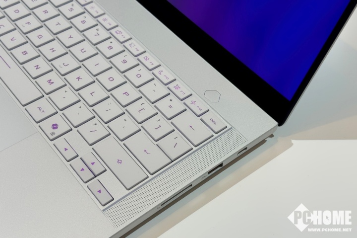 CNC一体成型金属机身带来了扎实的质感与强度,而约1.57kg重、1.59cm厚的尺寸,在14英寸性能本中脱颖而出,便携性堪称一流。背部的35段式光线矩阵灯效,则为其简约的设计语言注入了一抹未来的灵动感。