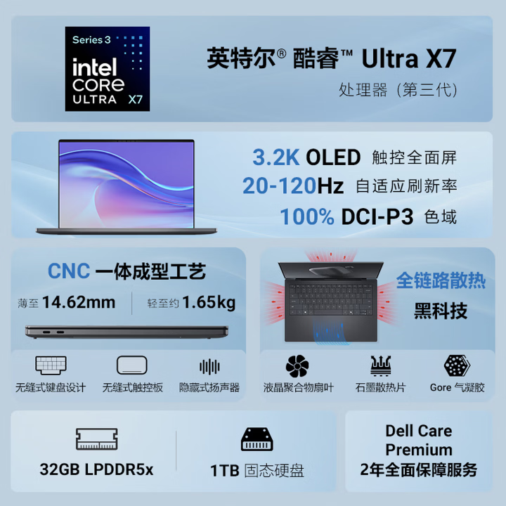 硬件配置方面,这款笔记本的核心动力源自英特尔的酷睿Ultra X7-358H处理器,拥有16个核心,搭配32GB的LPDDR5x内存和1TB固态硬盘,图形处理则依靠英特尔锐炫™核显。真正的亮点在于那块屏幕:16英寸的3.2K分辨率Tandem OLED触控屏,支持120Hz刷新率。这块屏不仅拥有500尼特的峰值亮度,还能实现20-120Hz的自适应刷新调节,并且完整覆盖了100% DCI-P3色域,视觉表现堪称一流。
