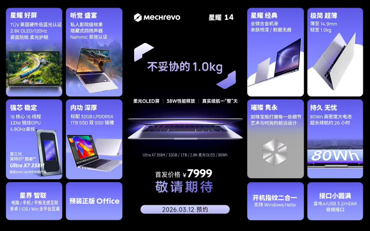 3月12日,机械革命星耀14的新配置——英特尔酷睿Ultra X7 358H版本,正式在电商平台开启预约。这款新品的最大亮点,在于将约1公斤的超轻机身与38瓦的持续高性能释放结合在了一起。它的首发定价为7999元,预计在4月10日正式开售。