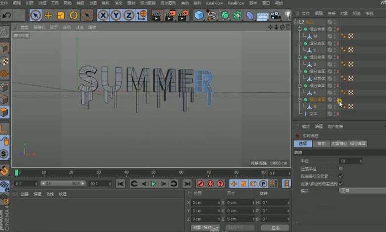 第四步,优化模型细节。打开细分曲面查看平滑效果。复制一份刚才的文字组备份,选择原始的组,执行“连接对象+删除”,将所有模型合并为一个整体。然后进入“边”模式,选中需要柔化的边缘,添加“平滑”变形器,并适当调整参数。特别要注意让冰块的中间部分比两端稍细一些,模拟真实冰块受重力影响的状态。