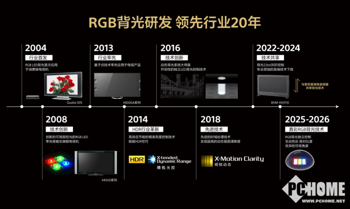一切卓越的体验,都根植于深厚的技术积淀。在RGB背光显示领域,索尼是不折不扣的定义者和引领者,其探索历程已超过二十年。回望技术演进之路,里程碑始于2004年推出的全球首款RGB LED背光电视QUALIA 005。此后,从动态背光系统到量子点技术,从高密度LED背光控制到高精度灰阶技术,索尼一路刷新着亮度、对比度与色彩纯度的行业标准。正是这些持续的创新,为今天真彩RGB技术的成熟落地,铺就了坚实的道路。