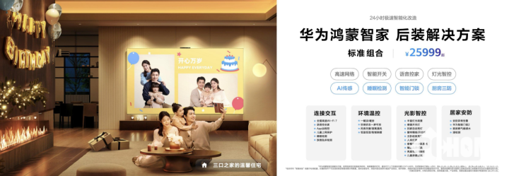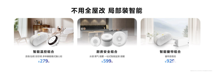 尤其值得关注的是对旧房改造需求的精准覆盖。华为鸿蒙智家推出了三档后装套餐:9999元的尝鲜组合、25999元的标准组合以及49999元的专业组合,全面覆盖从基础到进阶的全屋需求。如果预算有限或只想局部尝试,也有智能温控、厨房安全、智能窗帘等百元级的入门套装可供选择。这大大降低了智慧生活的体验门槛,让变革可以从一个场景轻松开启。