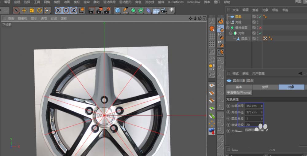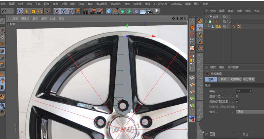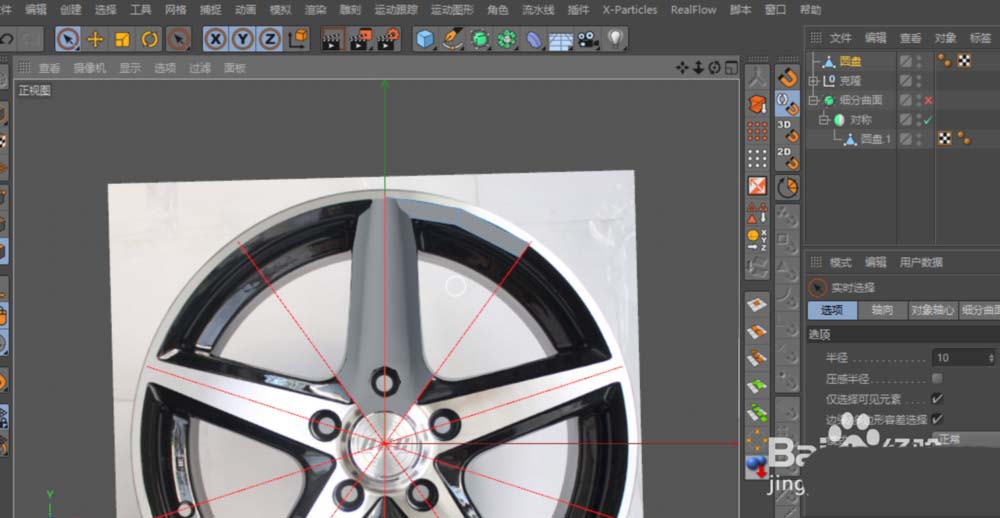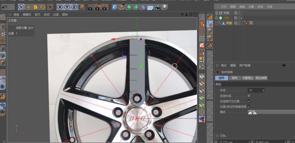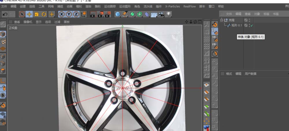 第一步,得先找一张清晰的汽车轮毂正面参考图。打开Cinema 4D后,按下快捷键“Shift+V”,直接在正视图中把参考图导入进来,这样后续建模就有了准确的依据。