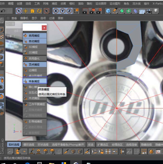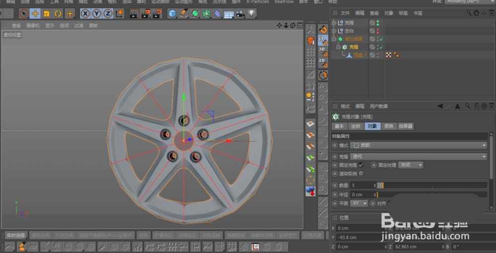 这种轮毂造型通常有很强的旋转对称性。所以,一个高效的建模思路是:只构建完整模型的五分之一,然后通过对称和克隆工具,就能轻松复制出其余部分。为了精确对位,可以先创建一条样条线,并用克隆工具设置为放射状克隆,得到几条关键的辅助线。这些辅助线在后续点对齐时,可是至关重要的“坐标尺”。