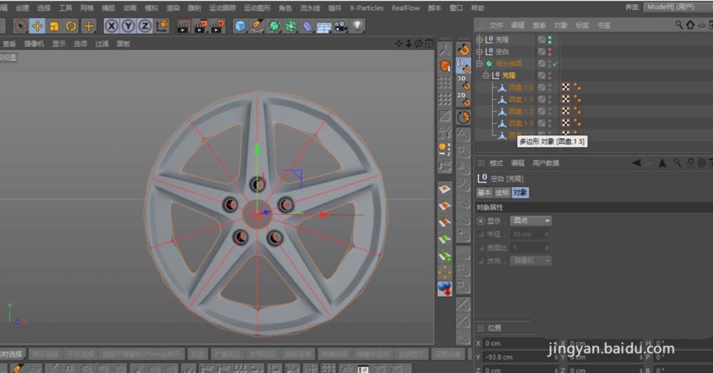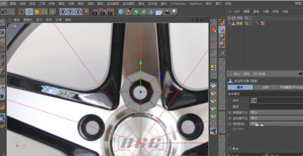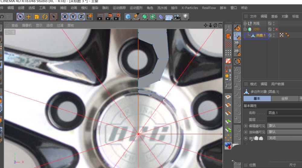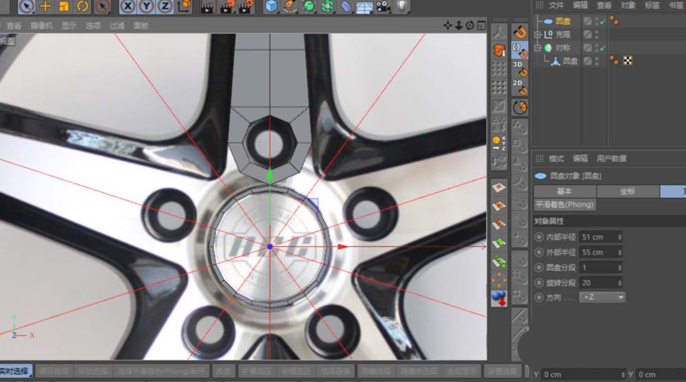 主体结构需要分层构建。再新建一个圆盘,分段设置与上一个保持一致。这个圆盘的位置,应对齐轮毂中心盖Logo的孔位。调整好后同样C掉,并与之前的圆盘使用“合并对象+删除”功能合二为一。然后,利用“连接”工具和“多边形画笔”工具,将这两个部分整合成一个连贯的多边形。