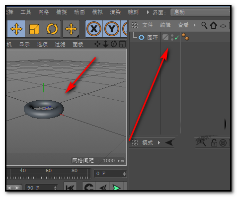 先别急,有个简单的验证方法:按下Ctrl+R渲染一下。瞧,渲染窗口里物体好端端地显示着。再看看界面右侧的对象管理器,环形对象的条目也赫然在列。这足以说明,物体并没有丢,只是它在视图里的“可见”状态被关闭了。